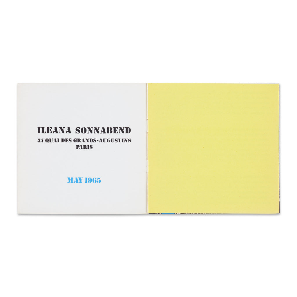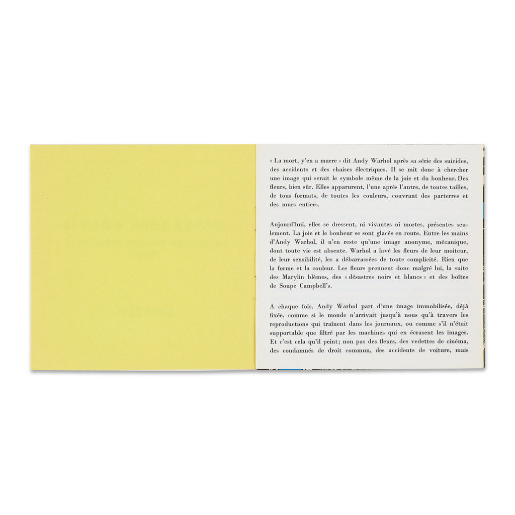 This small, square exhibition catalogue—now housed in a new custom-made box—was published to accompany an exhibition of Andy Warhol’s Flowers paintings at Galerie Ileana Sonnabend, Paris, in May 1965. This was the second Warhol exhibition at Sonnabend’s gallery, following a presentation the year before of the Death and Disaster series. The publication includes a two-color lithographic reproduction of a Flowers painting on its back inside cover, together with an essay in French by Otto Hahn. John Ashbery reviewed the exhibition for the international edition of the New York Herald Tribune, calling Warhol’s visit to Paris “the biggest transatlantic fuss since Oscar Wilde brought culture to Buffalo in the nineties.”