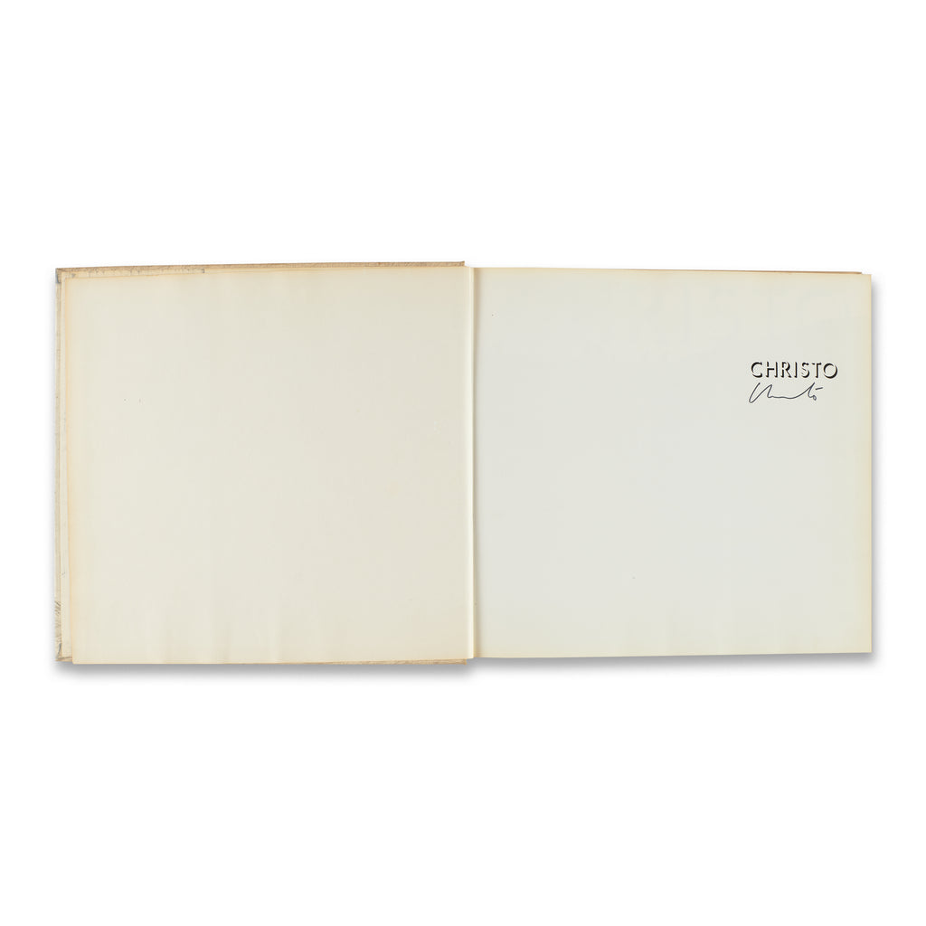 Published in 1972 during the “golden era” of Abrams monographs, this classic publication on Christo provides a well-illustrated overview of the artist’s early career, including an essay by David Bourdon. This signed copy features color and black-and-white photography of many of Christo’s first Wrapped Objects (1958–69), which incorporate conventional art materials such as paint cans and pigment bottles, swathed in resin-soaked canvas, as well as topographical maps and plans printed on vellum. The book has a partially transparent plastic jacket through which a cross section of a drawing reproduced on the cover is visible, alluding to the Wrapped Objects, which alternately reveal and conceal the enclosed items’ identities.