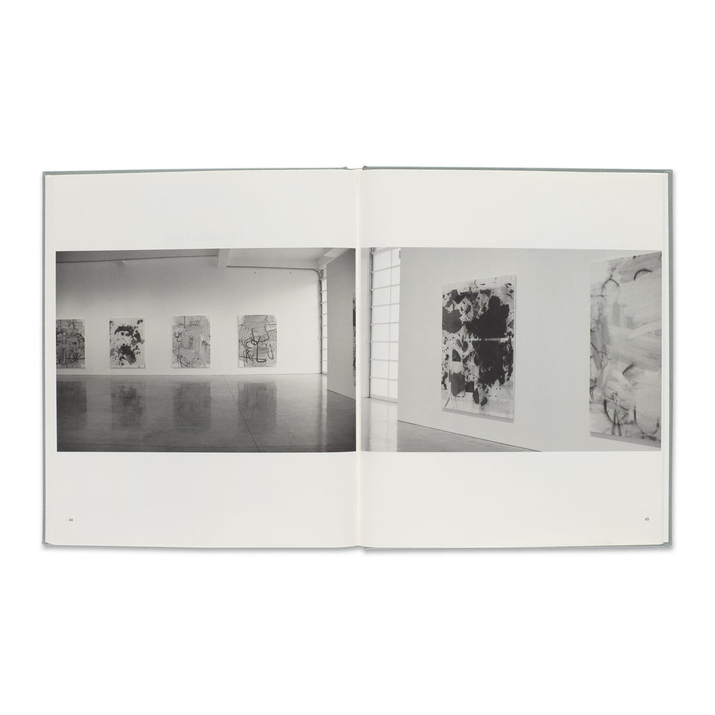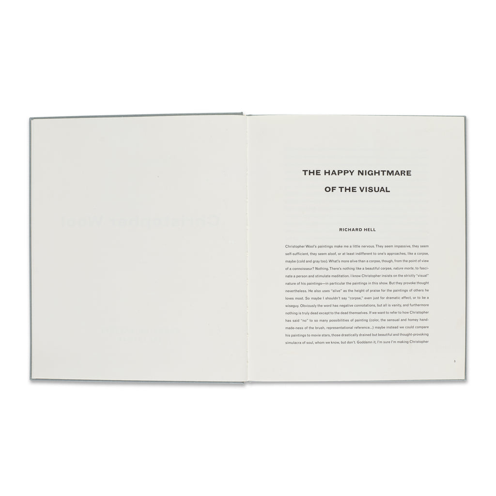 The catalogue includes tipped-in color plates of the paintings along with black-and-white photographs by Wool of the installation and a billboard he designed for the show. An essay by musician and writer Richard Hell reflects on the compelling quality of Wool’s works, noting that they feel like “paintings of paintings—while still making paintings as paintings.”