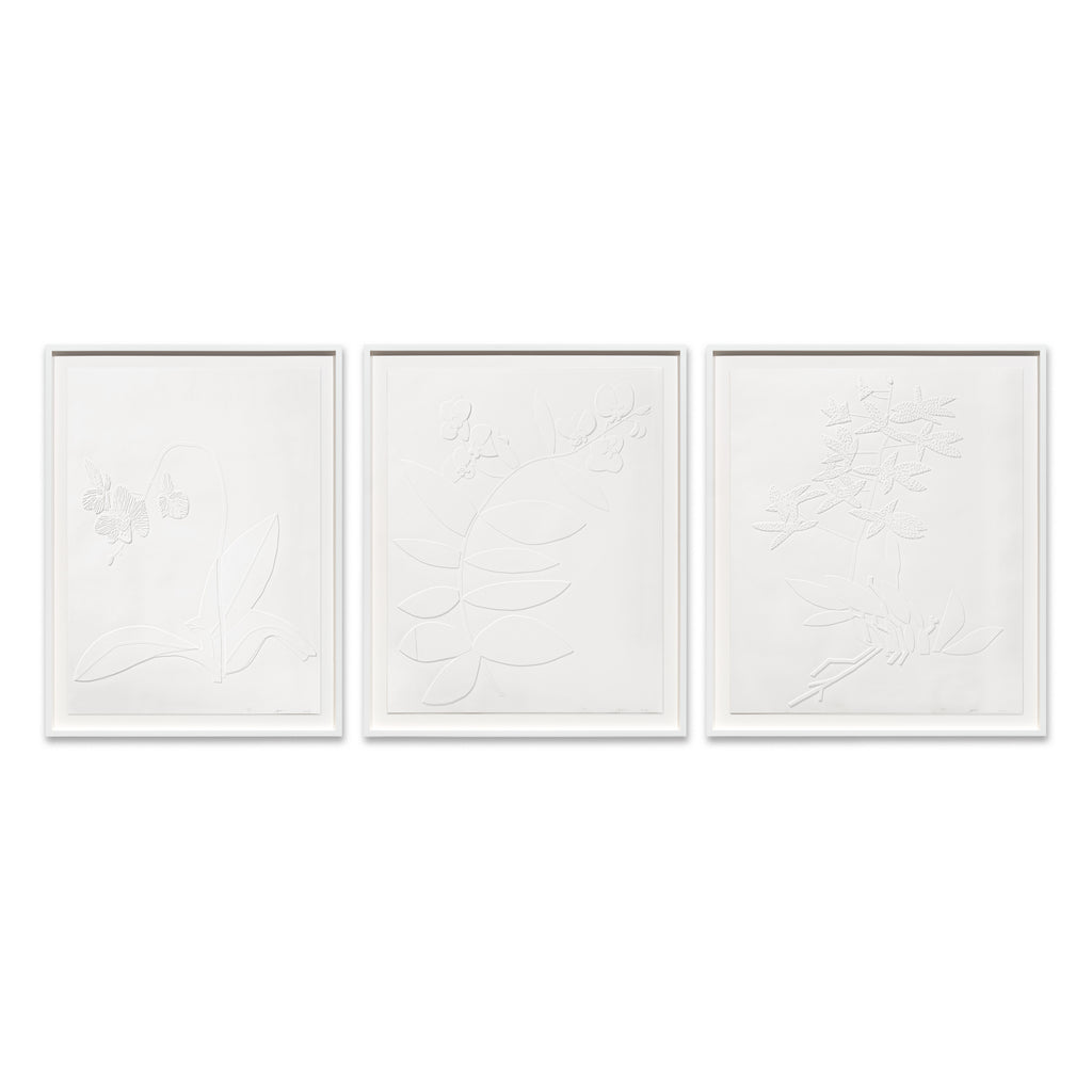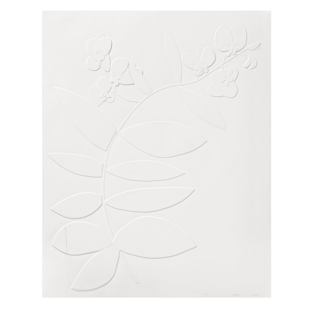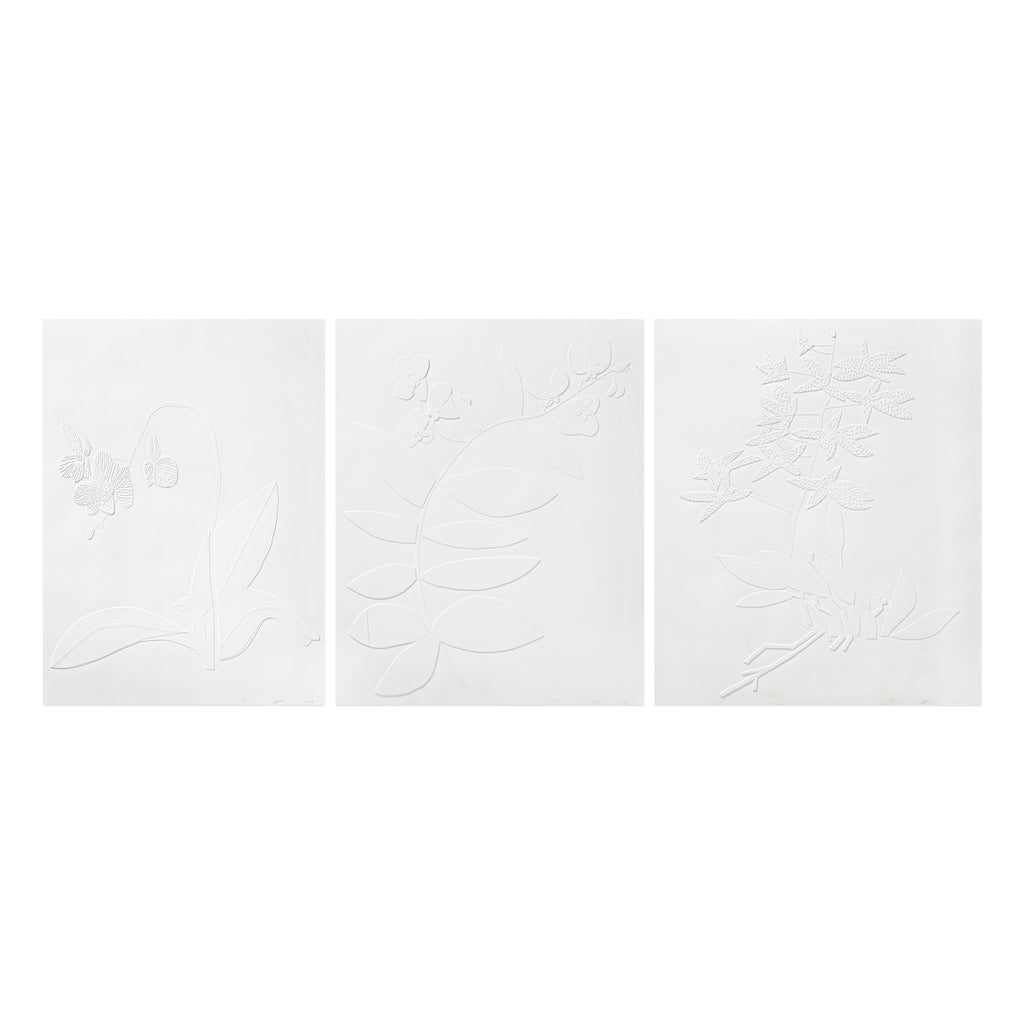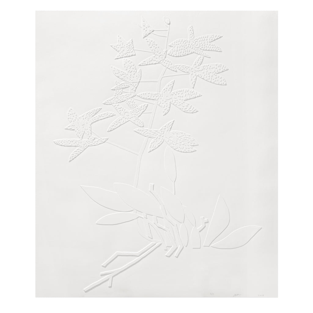 This set of three prints by Jonas Wood emerged from his Clippings series of paintings, in which the artist depicts segments of plants that have been literally clipped or borrowed from his other works. To produce them, he collaborated with the Los Angeles–based printmaker Mixografía, which has developed a proprietary method that uses a cast three-dimensional copper printing plate into which moist cotton paper pulp is inserted. Running the plate through a high-pressure press results in a debossed, colorless print that defines precise perspectival lines and surface details in relief.
