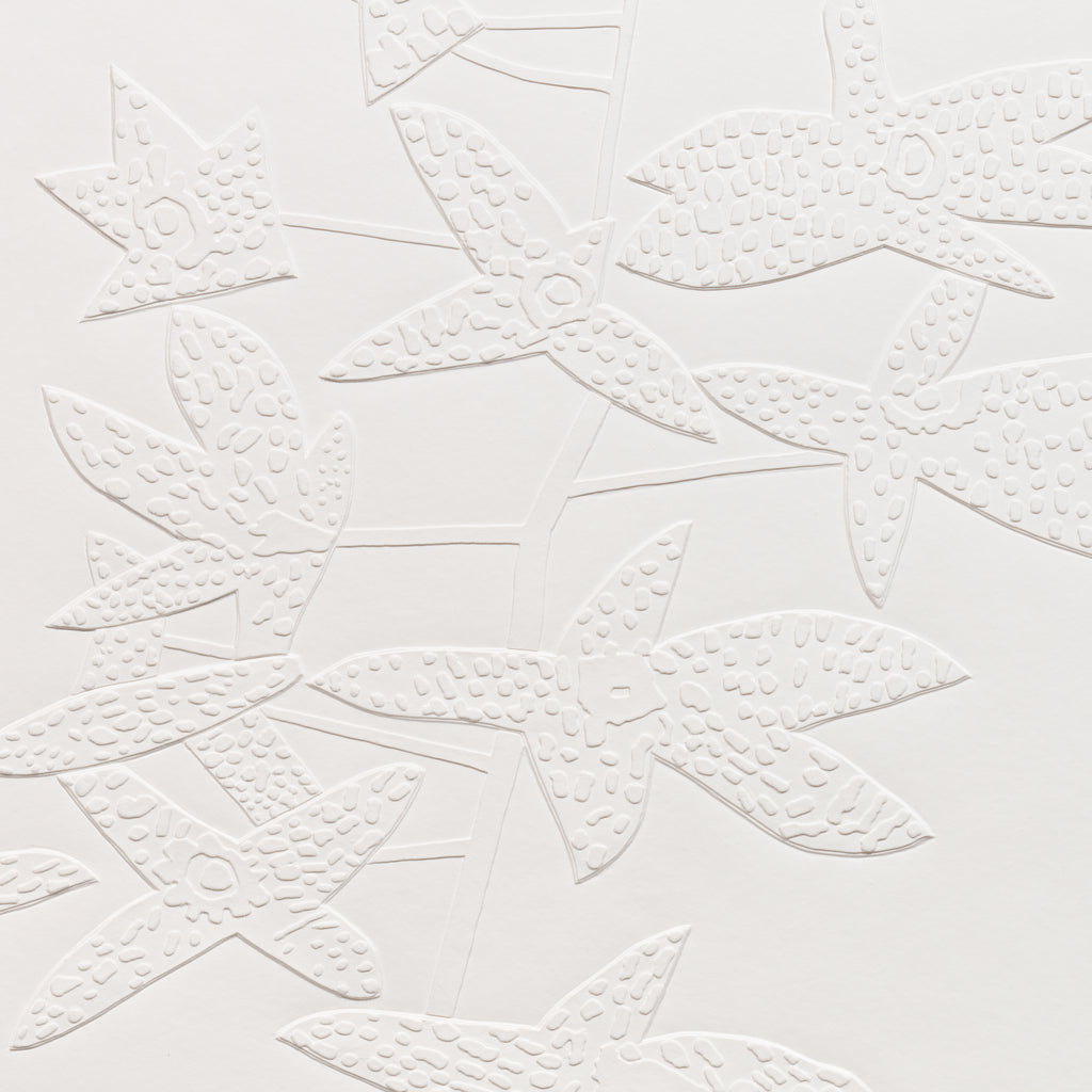 Wood has described the process of creating Three Clippings (White), noting: “To make the plates used in the printing process, I slowly cut out shapes of different weighted and textured papers, gluing and layering them on top of one another. This process built a three-dimensional form of my image, which was used to create the reverse of the mold needed to make the plates.”