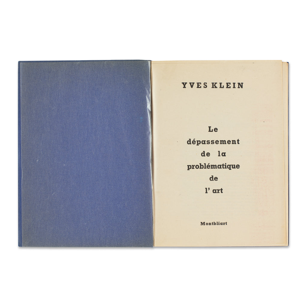 Le dépassement de la problématique de l’art collects Yves Klein’s writings, which he regarded as a significant complement to his art and intended to compile into a definitive volume titled Mon Livre. Along with several diagrammatic drawings, the texts reflect Klein’s audacious and often amusing approach to art making, encapsulated in essays and speeches such as “The Overcoming of the Problem of Art,” “Speech Delivered after the Opening of the Pneumatic Era,” “Outline of the Technical Manifesto of the Blue Revolution,” and “Speech Delivered on the Occasion of the Tinguely Exhibition in Düsseldorf (January 1959).”